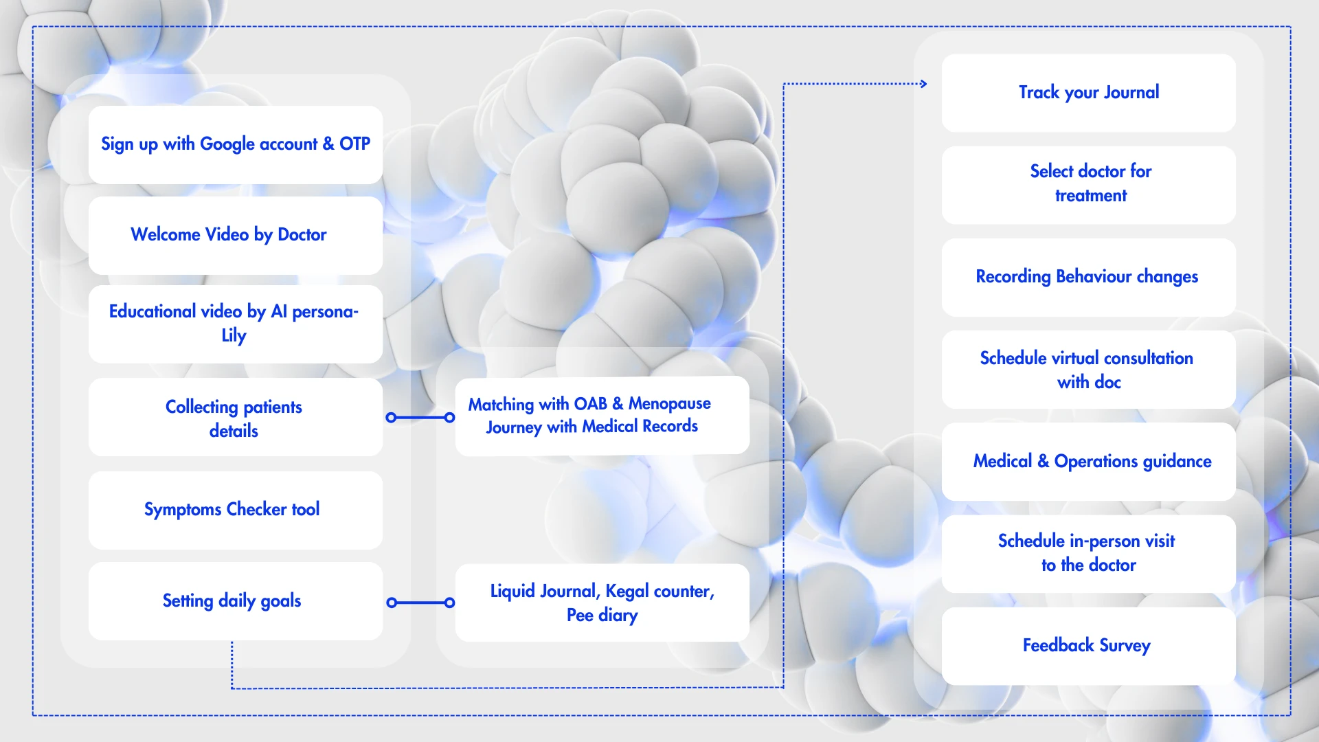This platform was built for a NASDAQ-listed healthcare clinic chain in the USA to revolutionize outpatient care delivery. The solution blends virtual-first care with in-person treatment options, focusing on conditions such as Overactive Bladder (OAB) and Menopause. It enables patients to seamlessly manage symptoms, set daily health goals, schedule appointments, and receive AI-powered guidance all while complying with strict healthcare security standards (HIPAA, HITRUST, SOC 2).